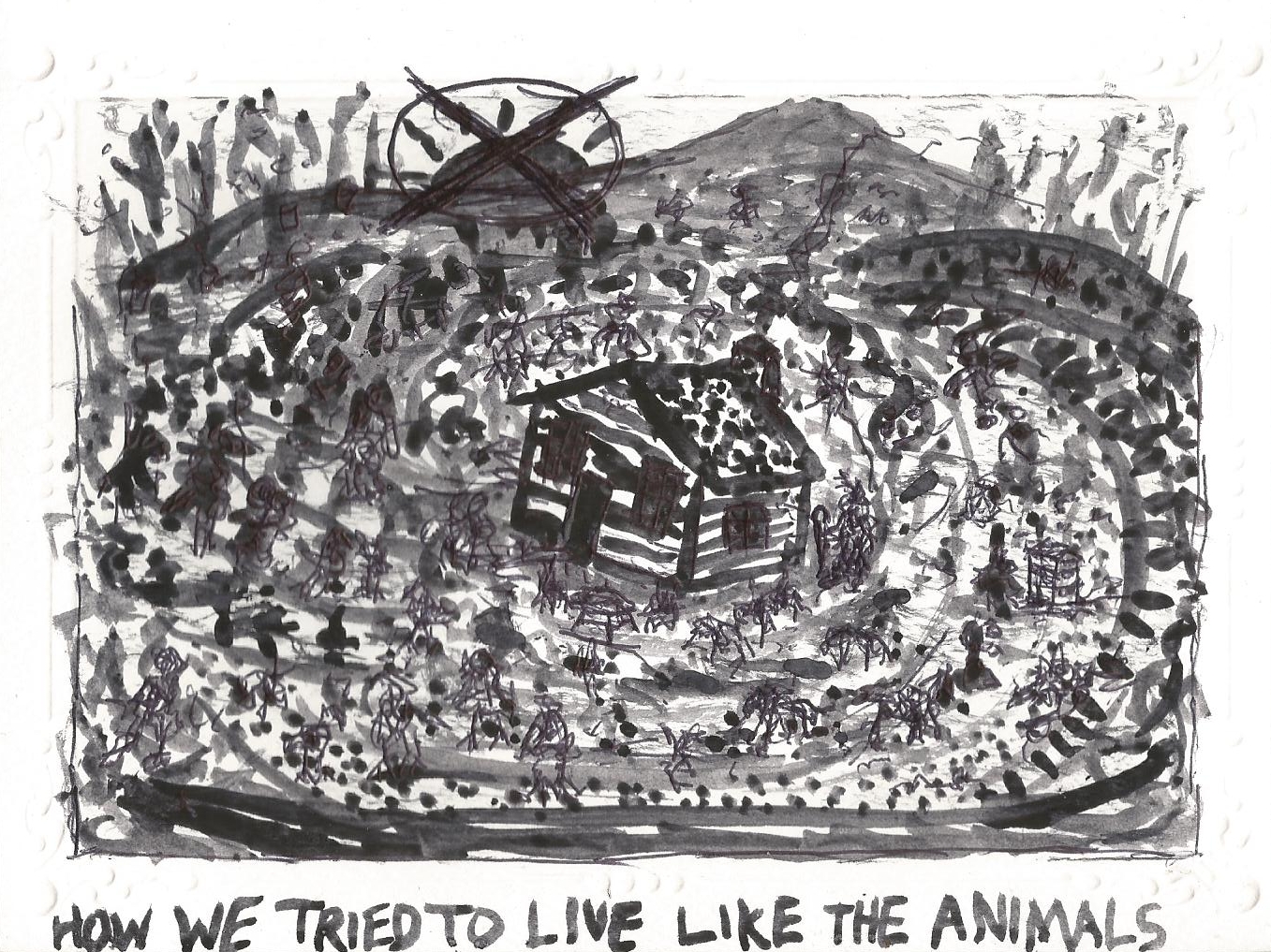 I haven’t been drawing pictures too much these days, or writing, or making videos, or sculptures, or any of that sort of thing. I’m preoccupied with my plans for starting a little farm. So this drawing is me making myself draw while thinking about working with my hands and back in the sun with all the animals and plants and humans around working and growing and eating and shitting and living and dieing together.