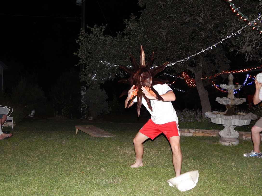 Over the course of the afternoon people gorged every nook and cranny of their stomachs with the finest Central Texas cuisine and were treated with the sweetest southern hospitality. Misting hoses were hung overhead to cool those unaccustomed to the warm August days in Texas. Everything from Merle Haggard to the Grateful Dead floated softly on the warm breezes thanks to Wes’s ability to create that perfect musical flow. In the late afternoon Rick and Meredith opened their gifts including lots of things I didn’t see and also the passing of the Postmaster Commandant of Mars (a painting) to the newly weds. Earlier, circa 1999, the painting found its way to the house that Rick, Wes, and I inhabited – mentioned previously. The piece depicts a blond feathered hair woman in a blue uniform shirt with a background of black and her arm resting on what appears to be a small facsimile of the red planet Mars. As a whole it resembles terrible attempt to paint a Glamour Shot Photo at the same time resembling an astronaut press photo embodied with an aura of truth and wisdom. Wes also gave them a pretty amazing bison skull. Rick’s great aunt Pat gave her truly thoughtful blessings and gifts while James delivered a hilarious speech leaving some to hope he pursues comedy writing as a hobby. Unfortunately, unless you had the ability to find room in your stomach, most missed the cutting of the cake inside the house but those who did were treated to Meredith’s sweet and inspiring wedding song to Rick sung a capella. Swimming trunks as well as boxers and cutoffs were donned as the above ground pool was assailed and turned into a churning whirlpool as five adults ran the perimeter wall. Surprisingly it failed to collapse but we tried our hardest. As the afternoon gave way to the evening friends, family, and neighbors could be seen bidding their farewells and rolling themselves to their vehicles while the hardiest of souls and livers remained. Enter bravely a 1.75 liter bottle of Cazadores! A fast beat techno style song emerged on the sound system. As a present, Rick and Meredith received a large bronze colored hanging sun face which Wes grabbed and held to his face followed by Rick with an iPhone light behind a small plastic moon face. The midnight dance of the sun and moon had begun. Wes is central in the above photo with Rick to the right and Robin and Big Rick’s feet to the left.